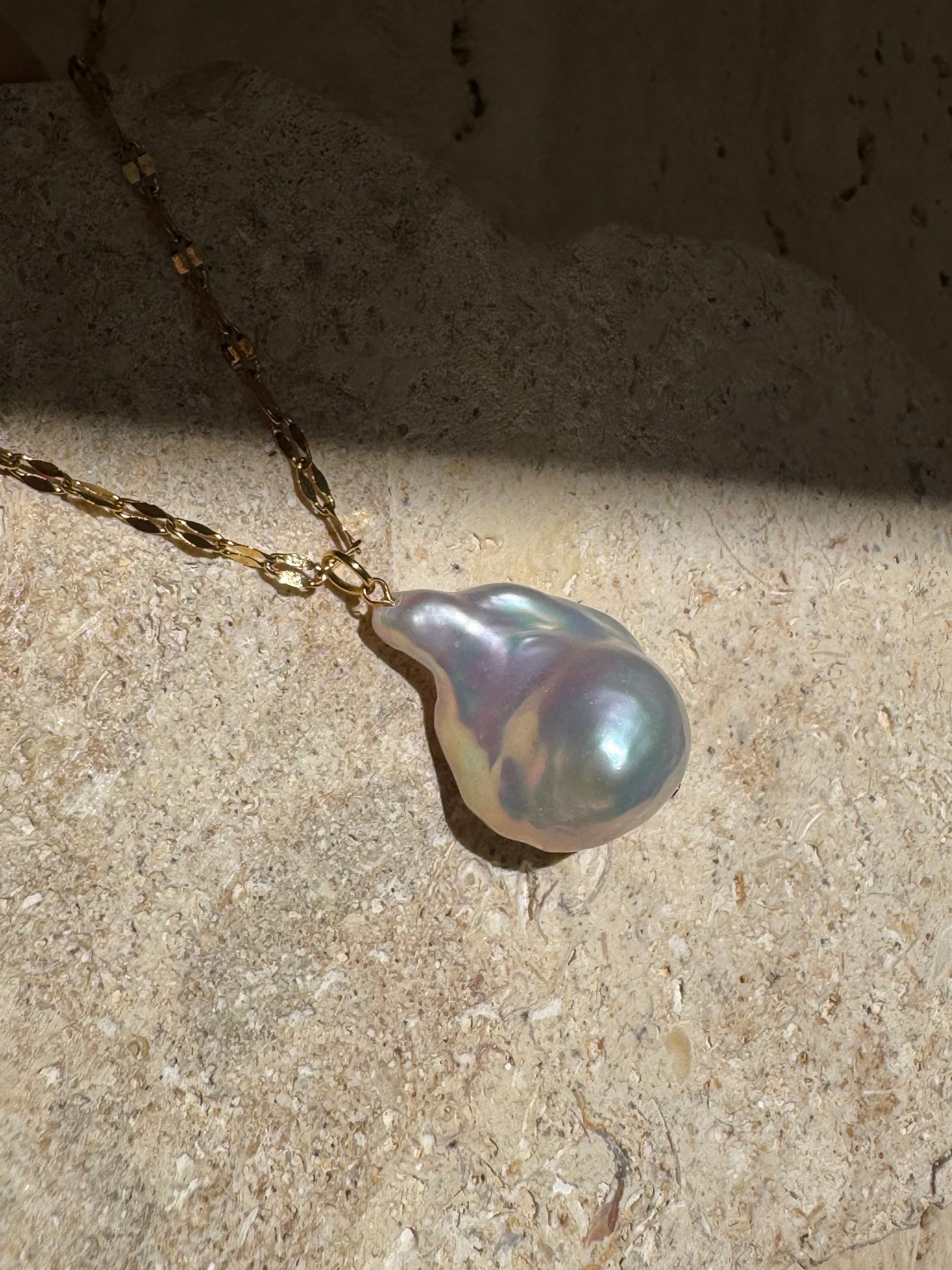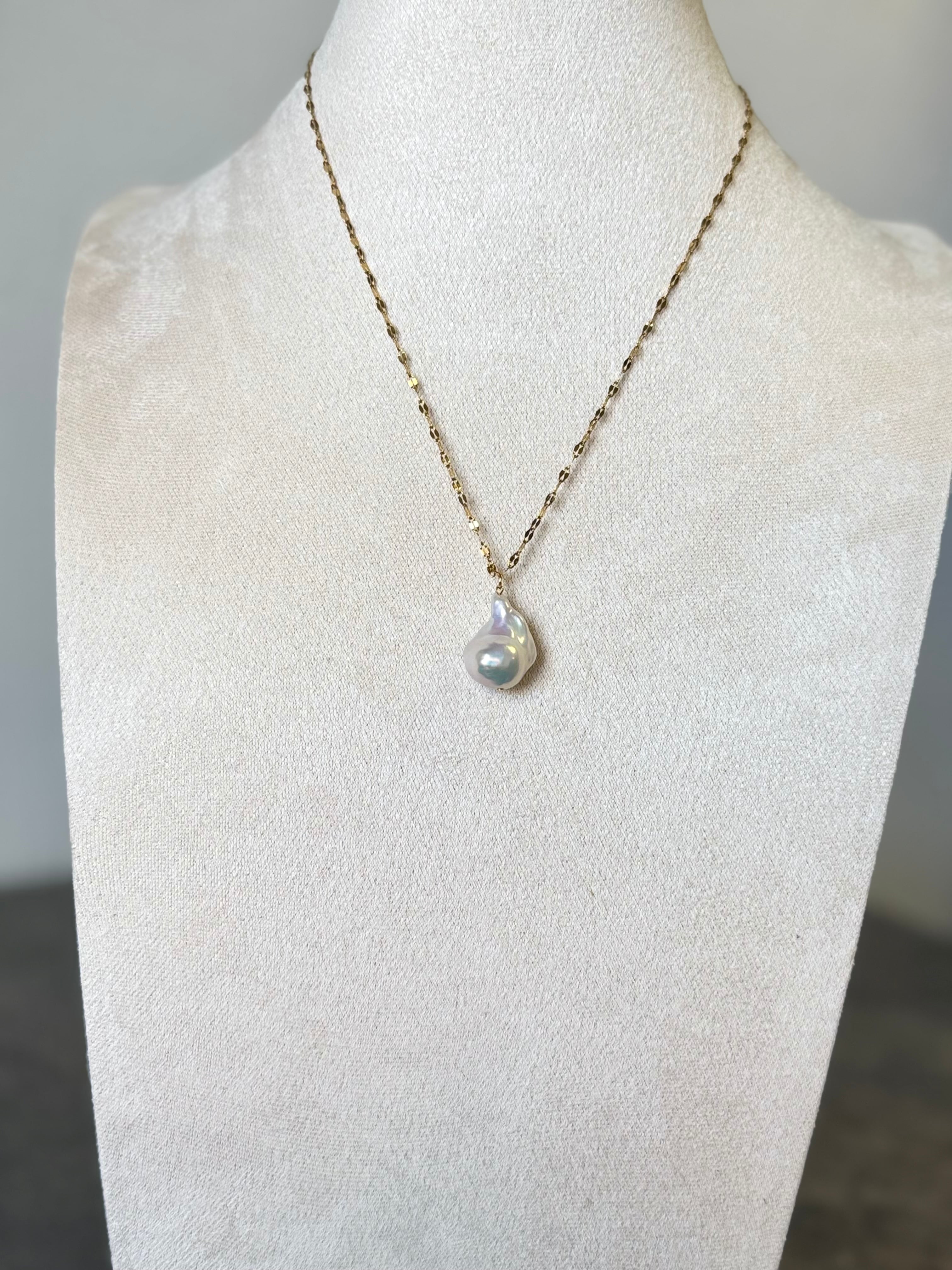 アイスブルー輝く神秘的なホワイトカラーの大粒バロックパールのネックレスです。