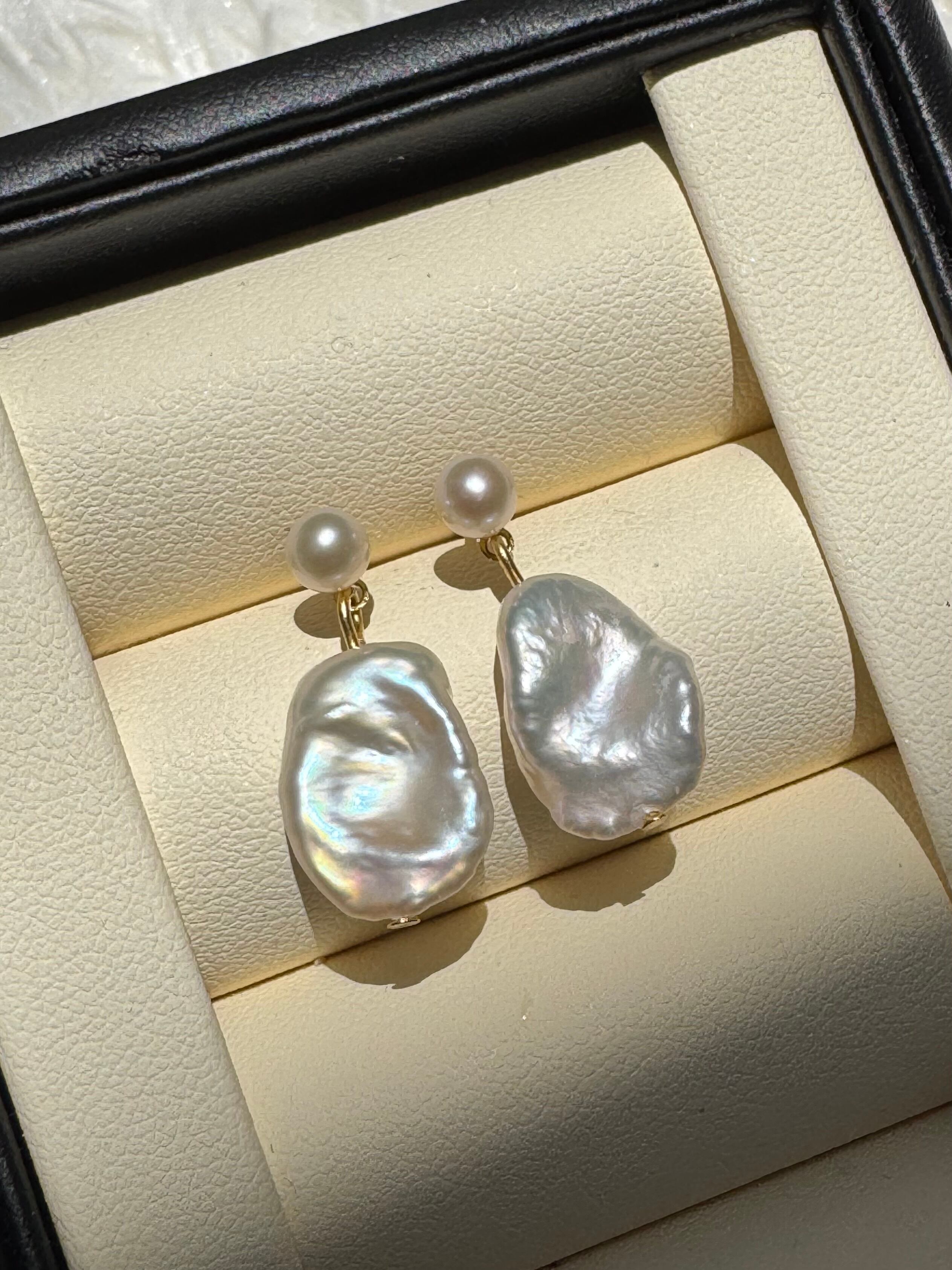 セミラウンドのベビーパールと、花びらのようなケシパールを合わせた連なりピアスです。