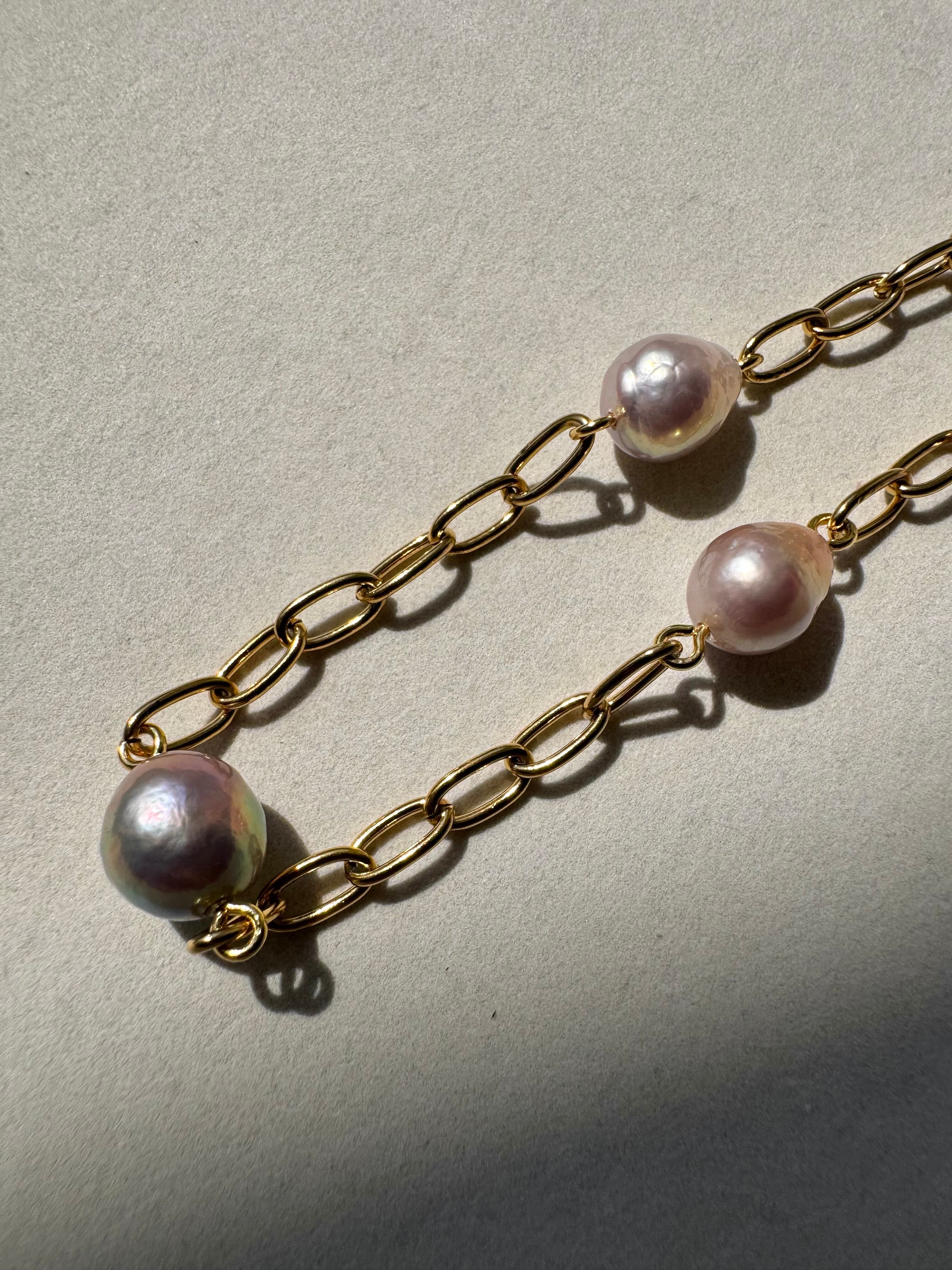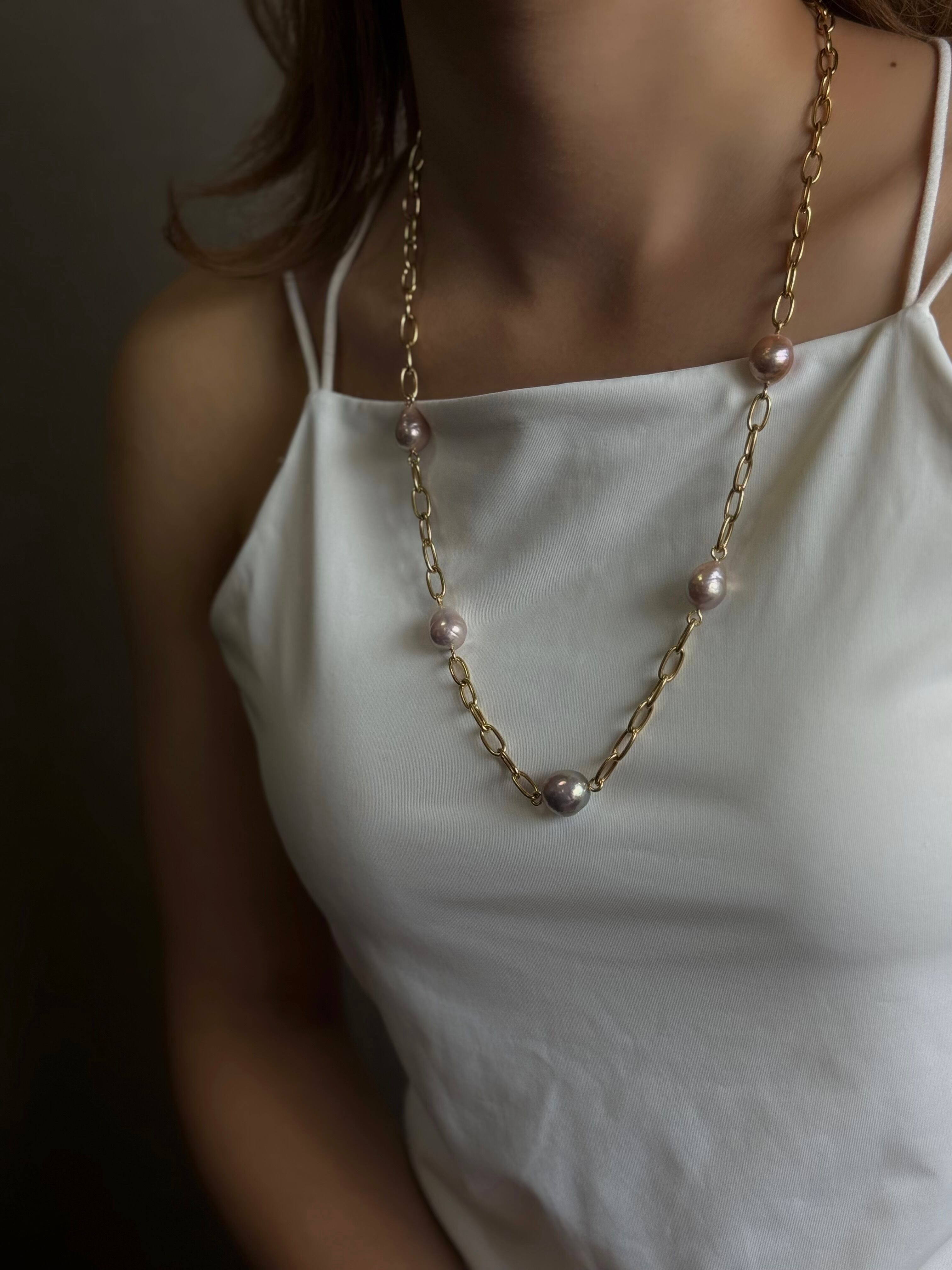 大ぶりなチェーンと真珠の上品さがラグジュアリーなスタイルを演出します。