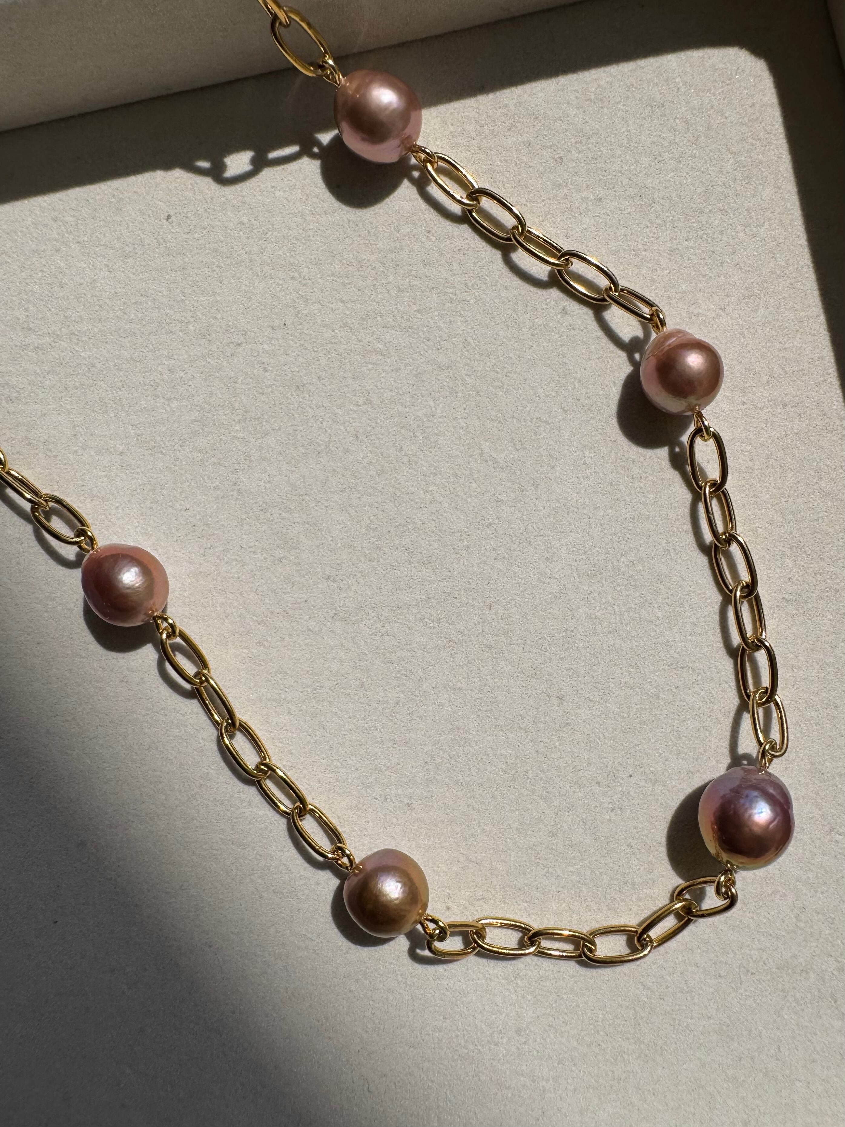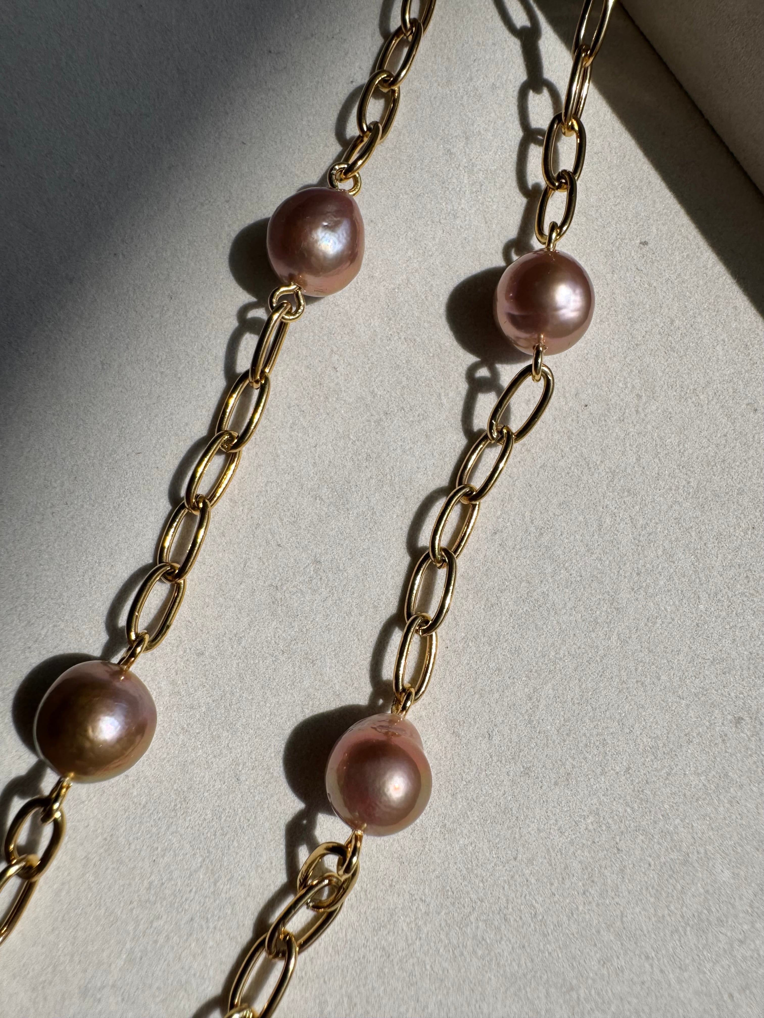 大ぶりなチェーンと真珠の上品さがラグジュアリーなスタイルを演出します。
