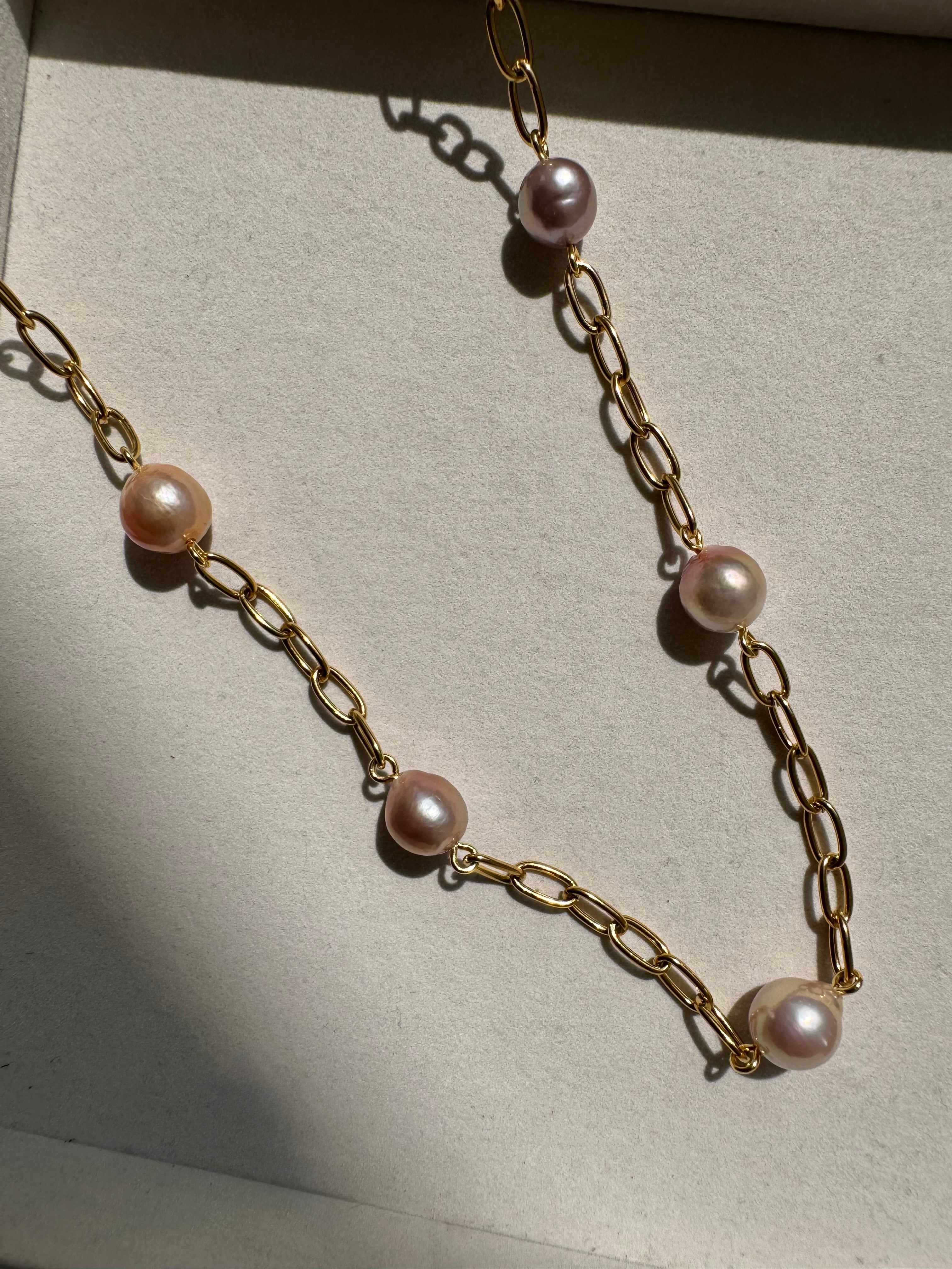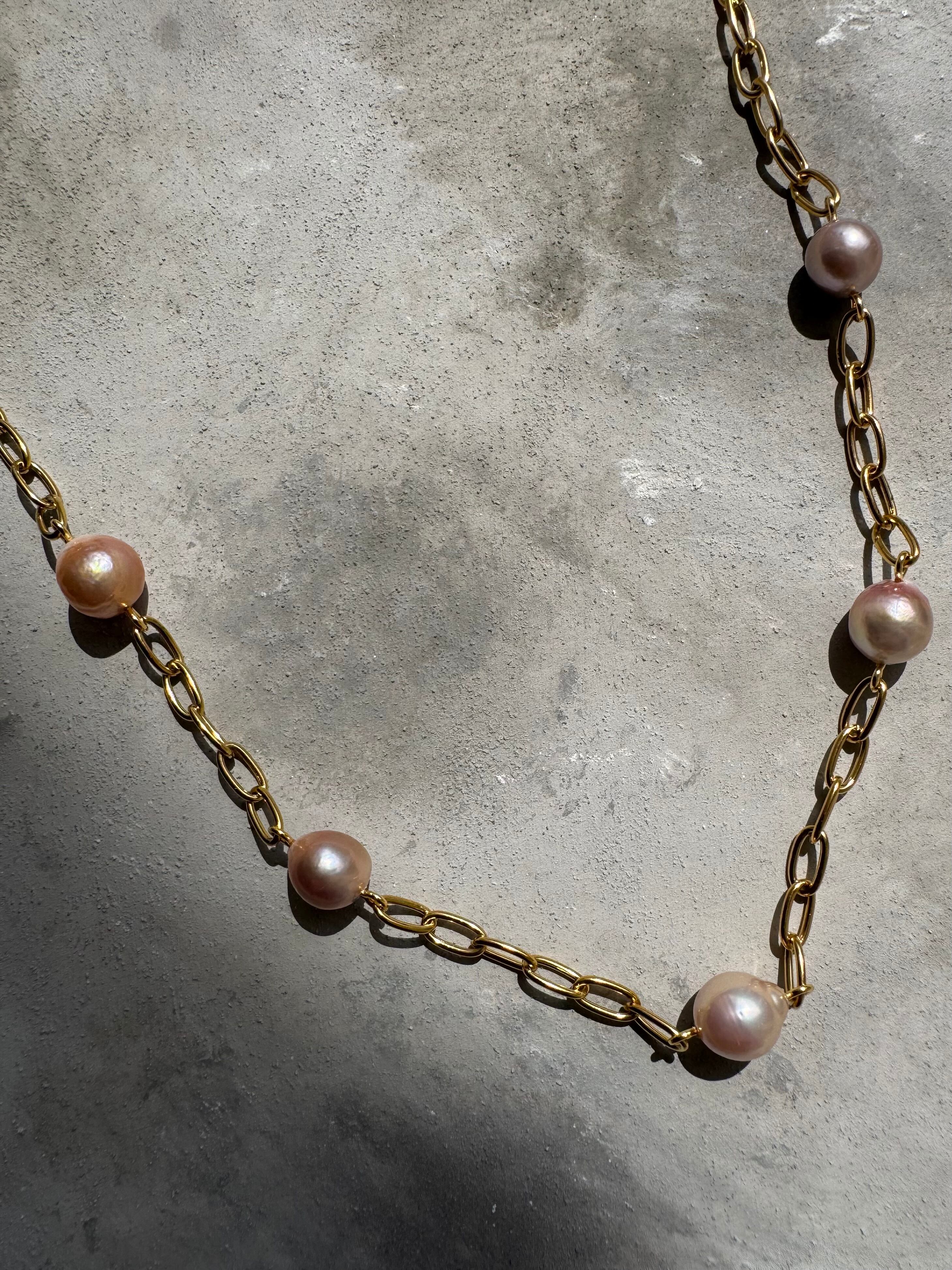 大ぶりなチェーンと真珠の上品さがラグジュアリーなスタイルを演出します。