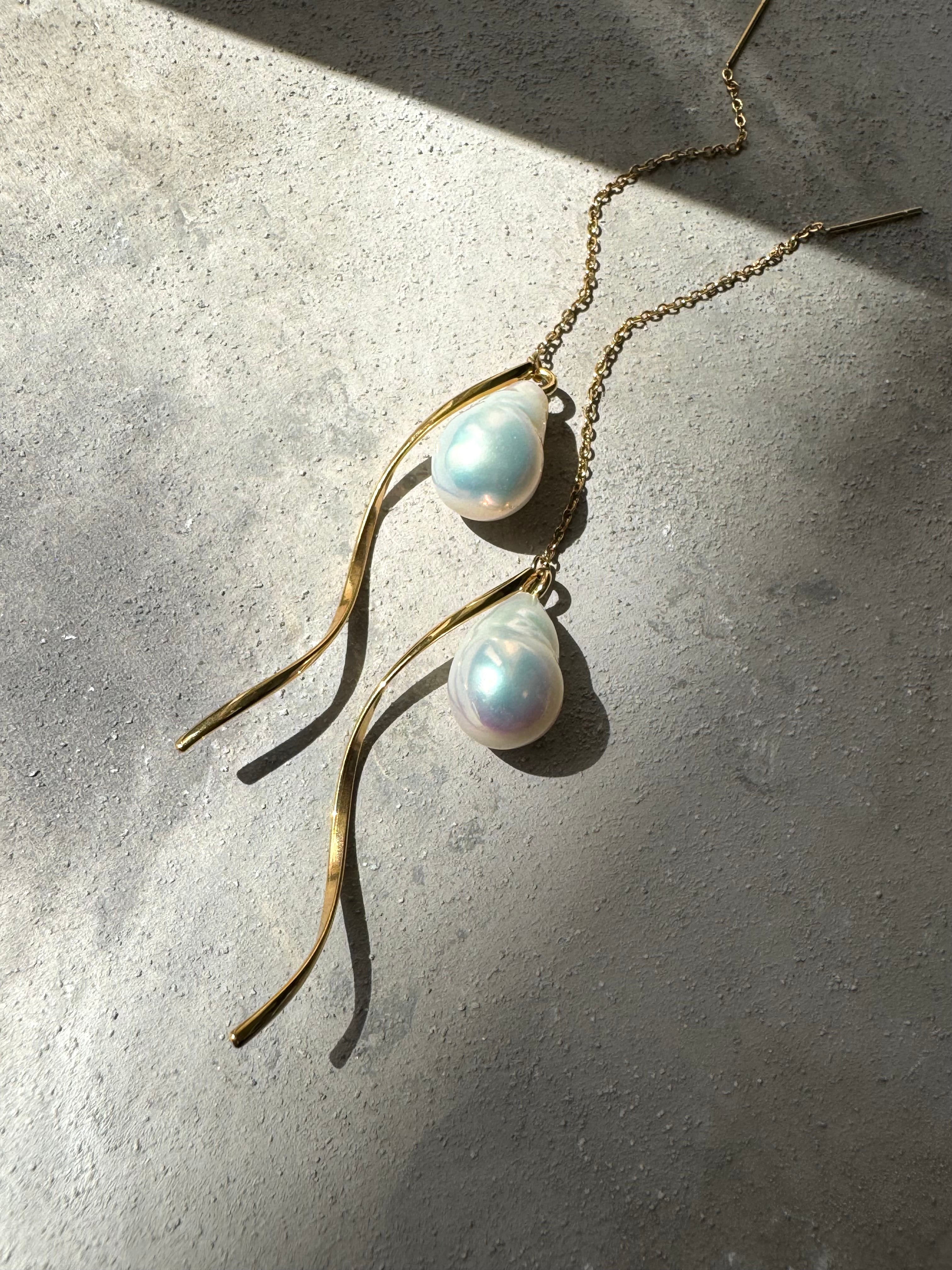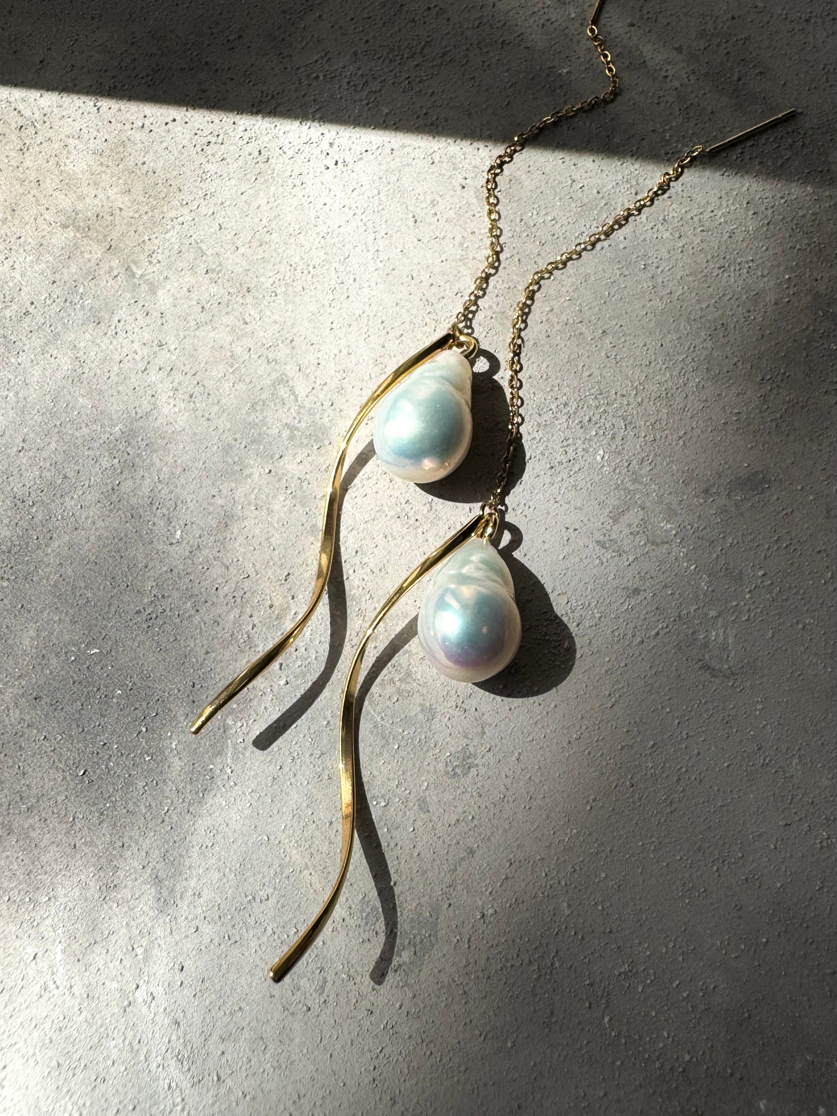 うるっと水々しい水滴のような美しいホワイトブルーが上品に輝く、淡水真珠のウェーブピアスです。