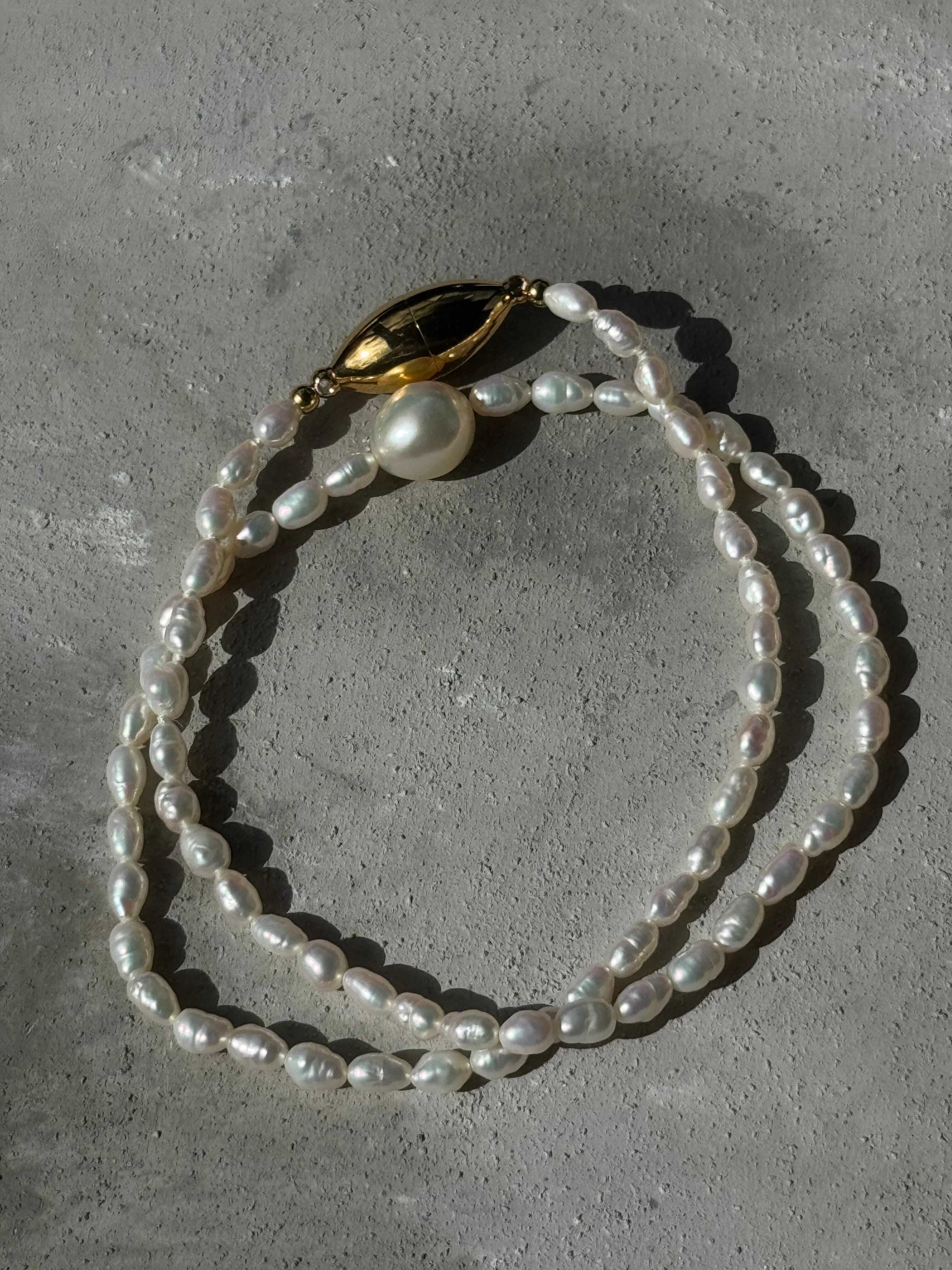 繊細なライス型の淡水パール連ねた、ナチュラルなムード漂うネックレス。