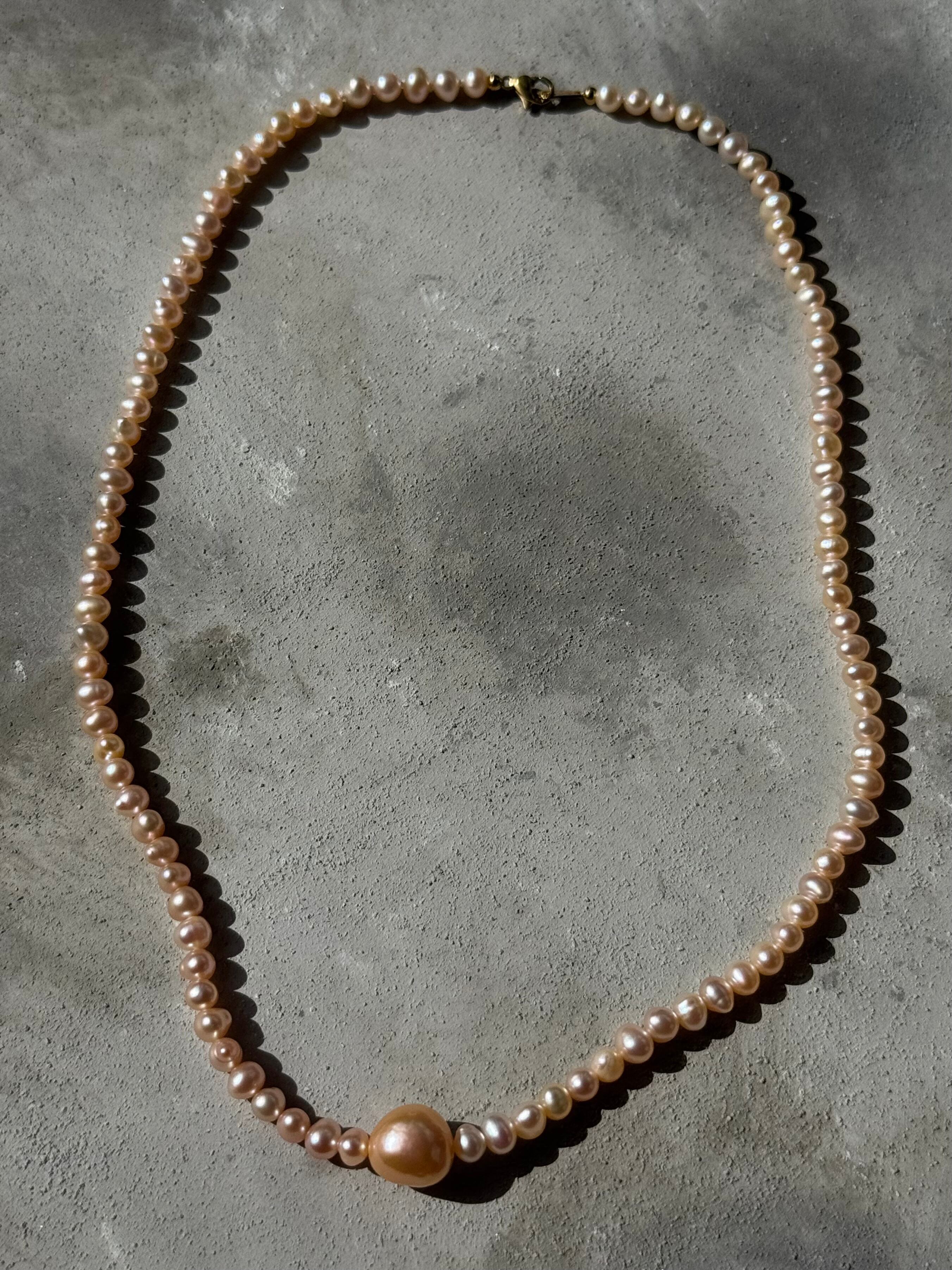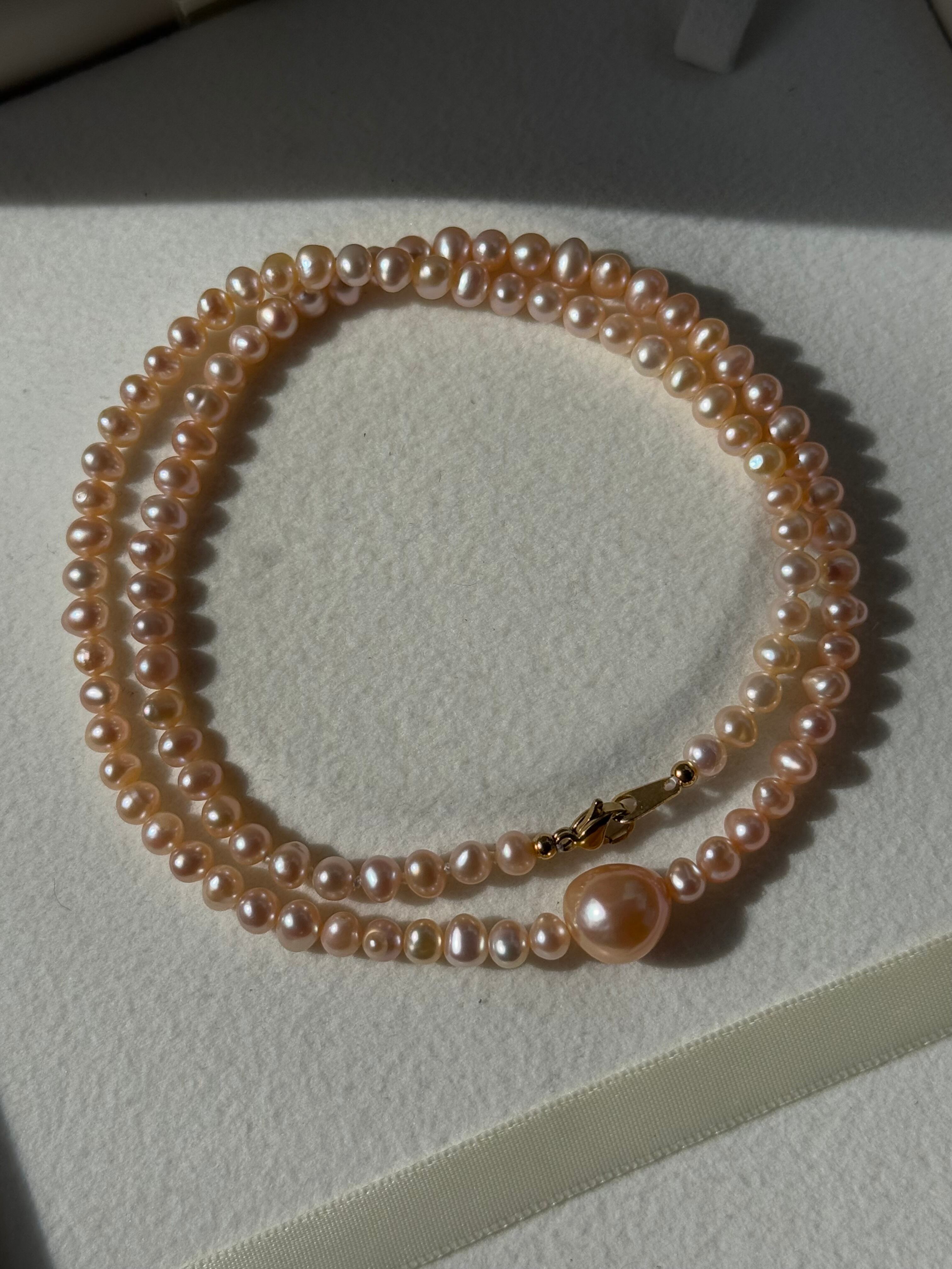 繊細なベビーパールの連なりに、大粒の淡水パールをひと粒添えたデザイン。少し長めのタイプになっています。