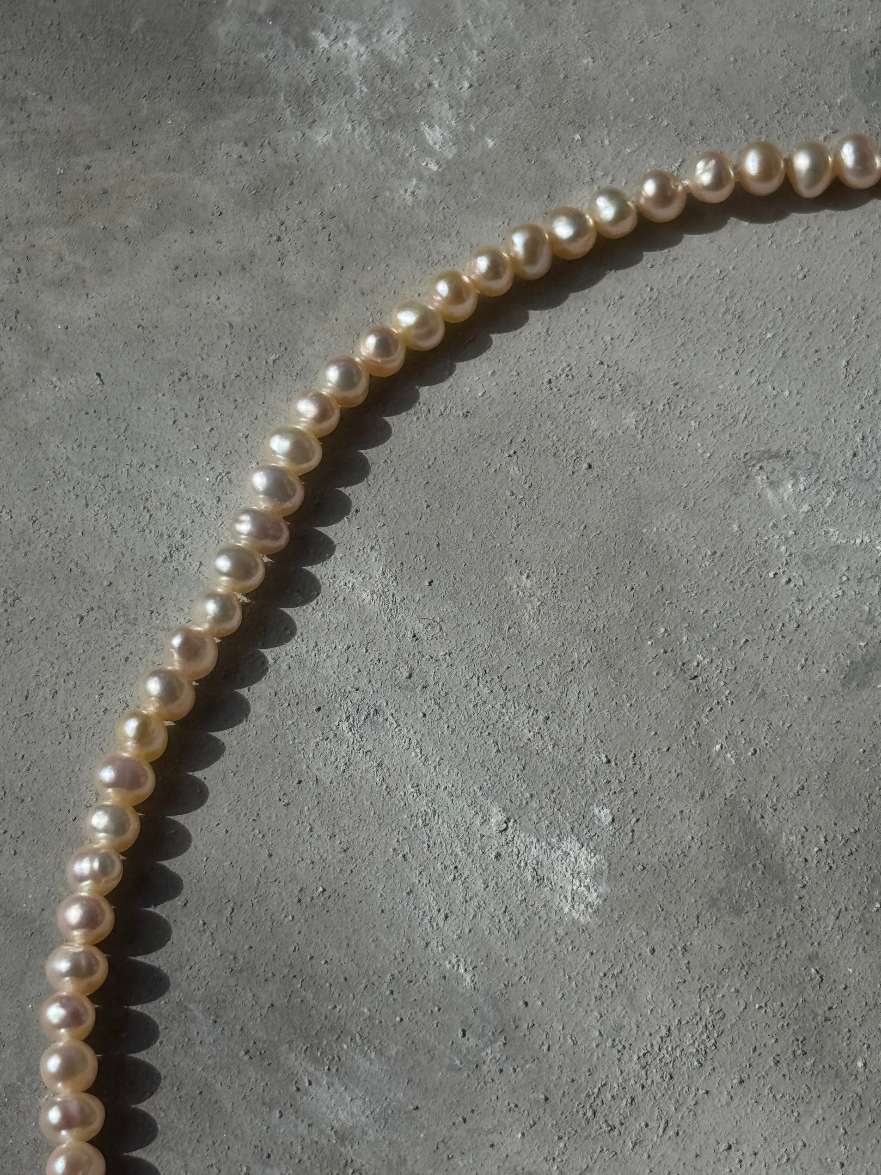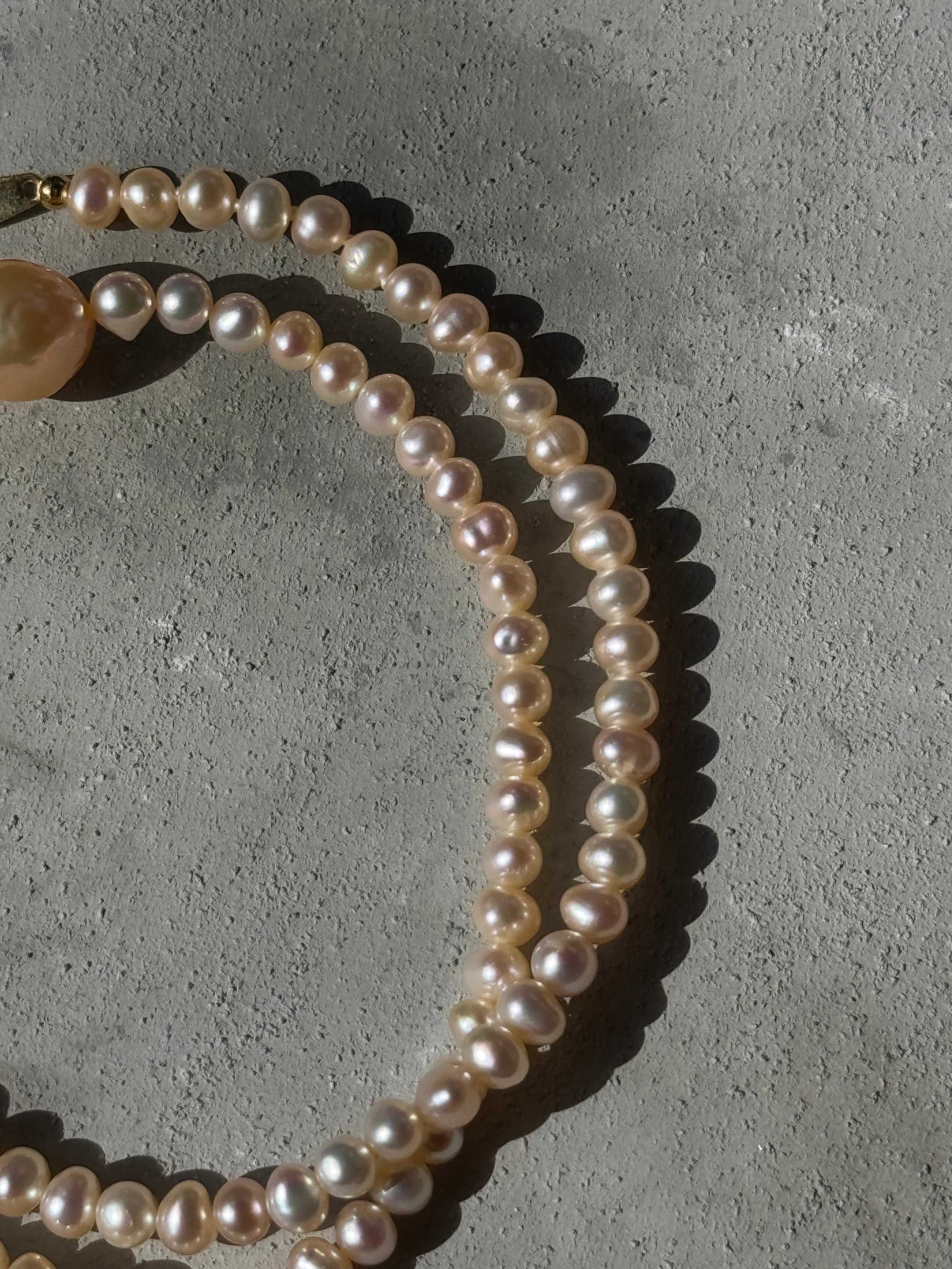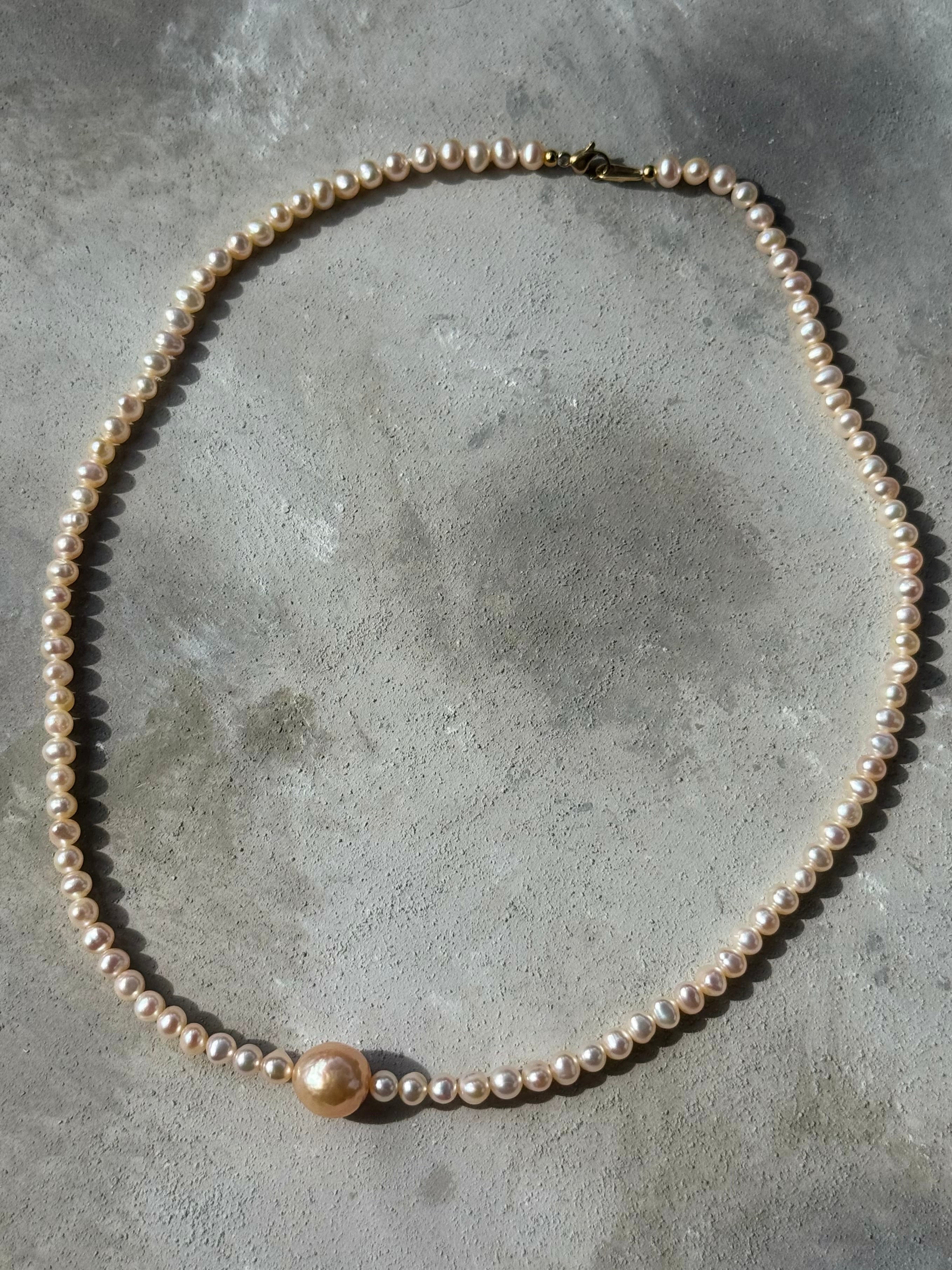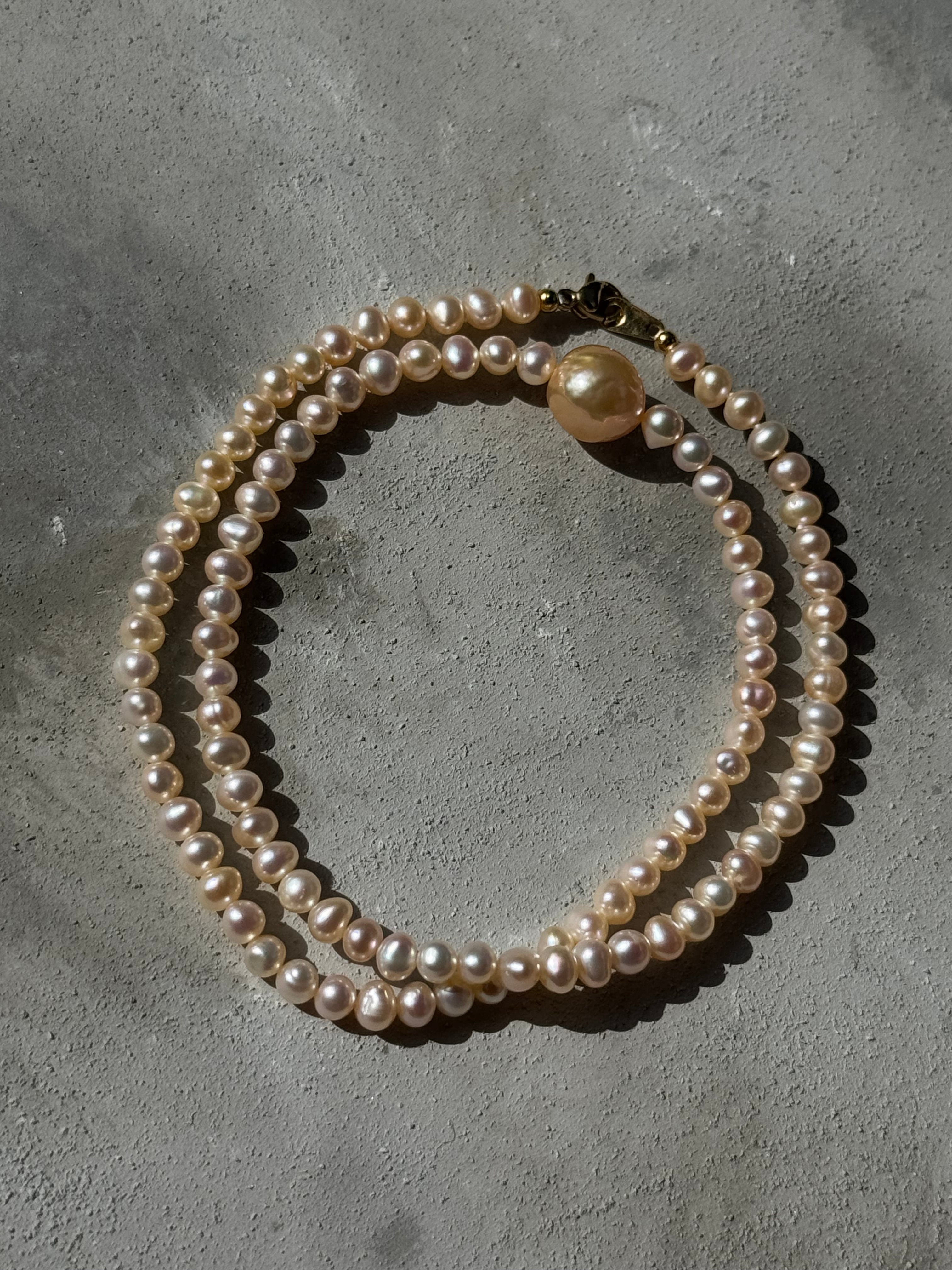 繊細なベビーパールの連なりに、大粒の淡水パールをひと粒添えたデザイン。