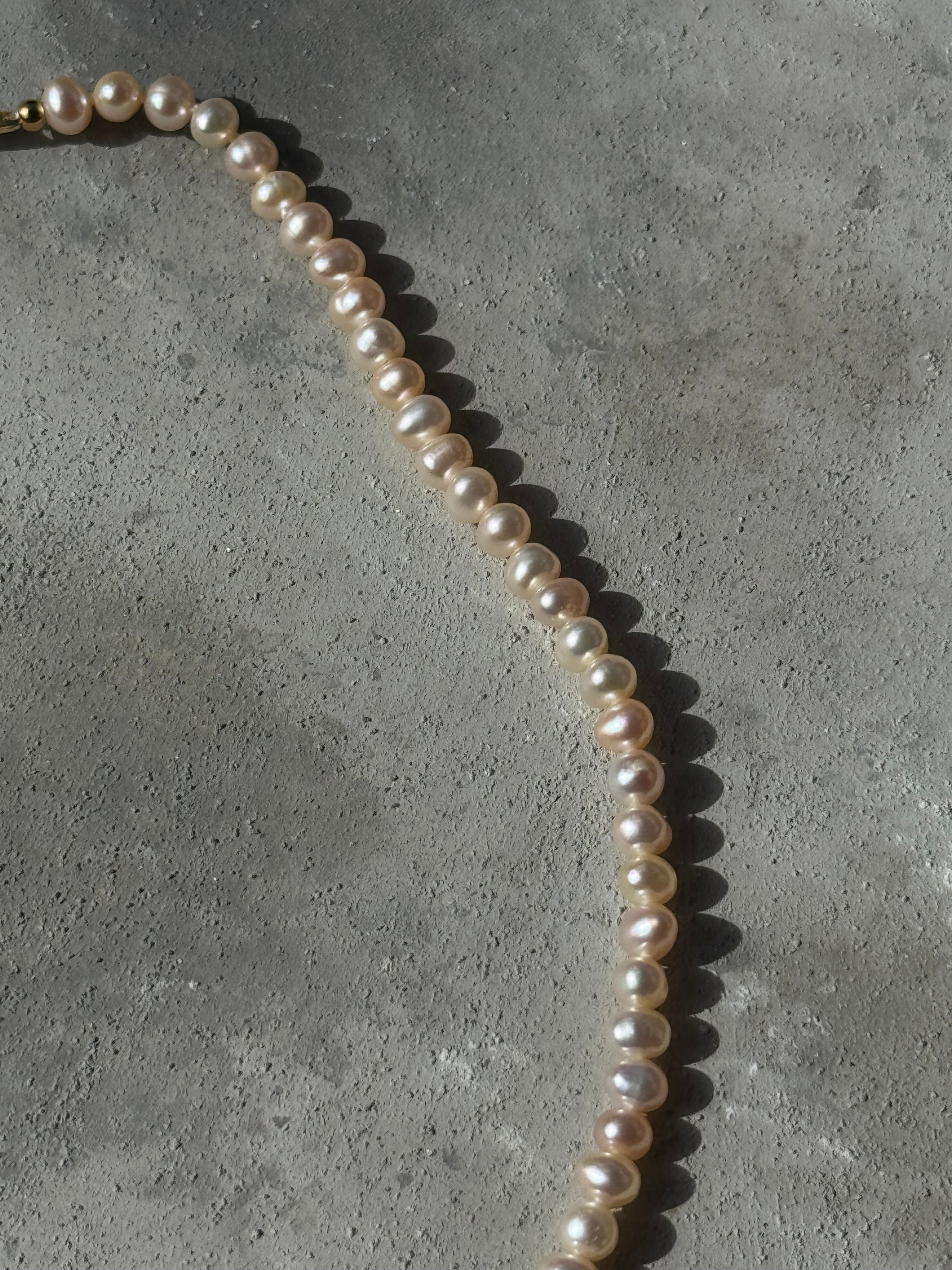 クラシックなベビーパールに、今の空気感をまとわせた、モダンな一本に仕上がっています。