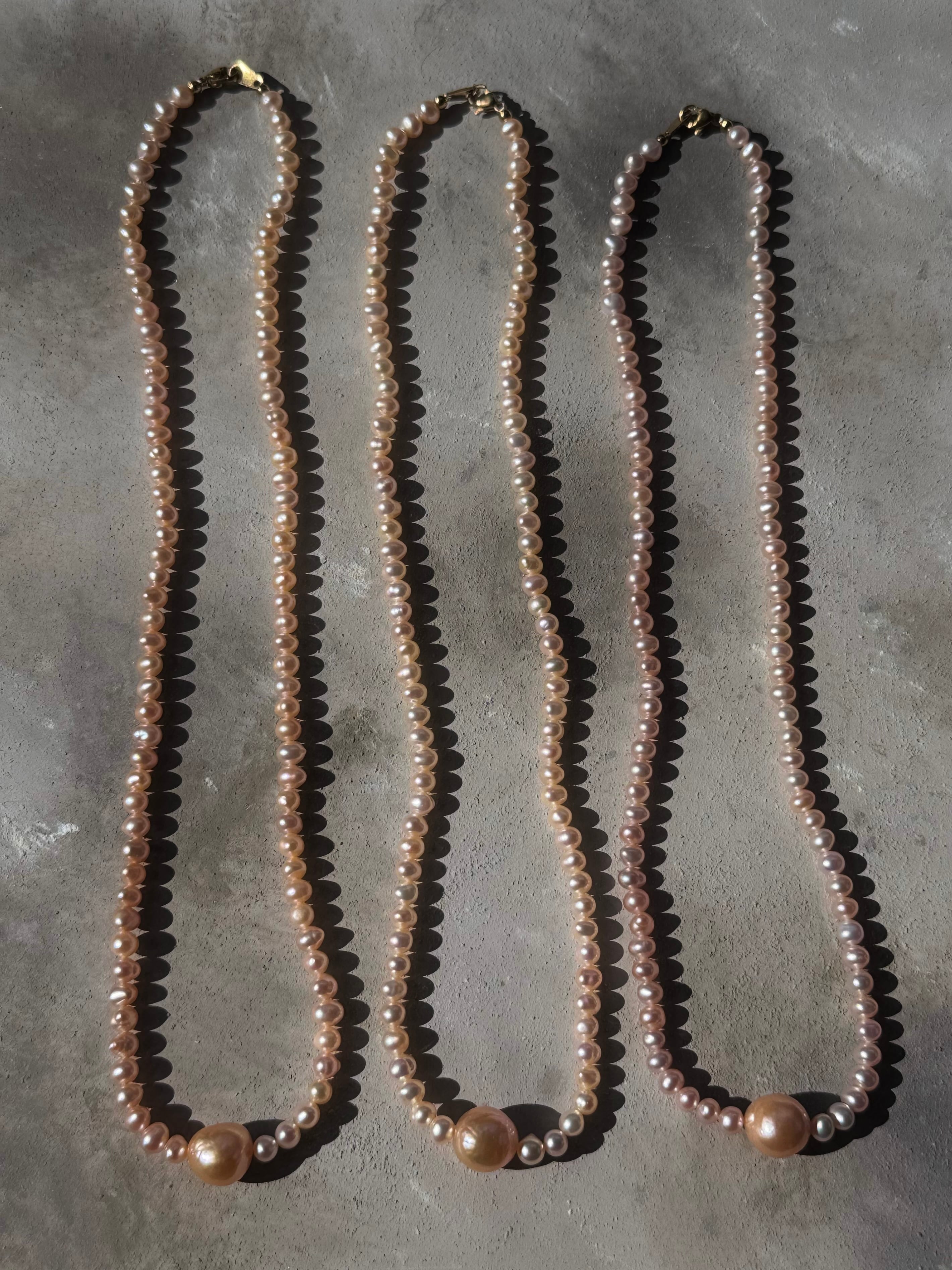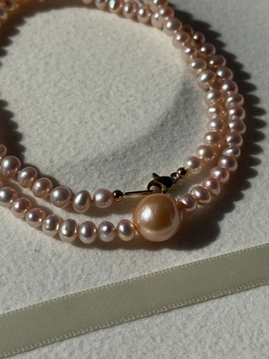 繊細なベビーパールの連なりに、大粒の淡水パールをひと粒添えたデザイン。